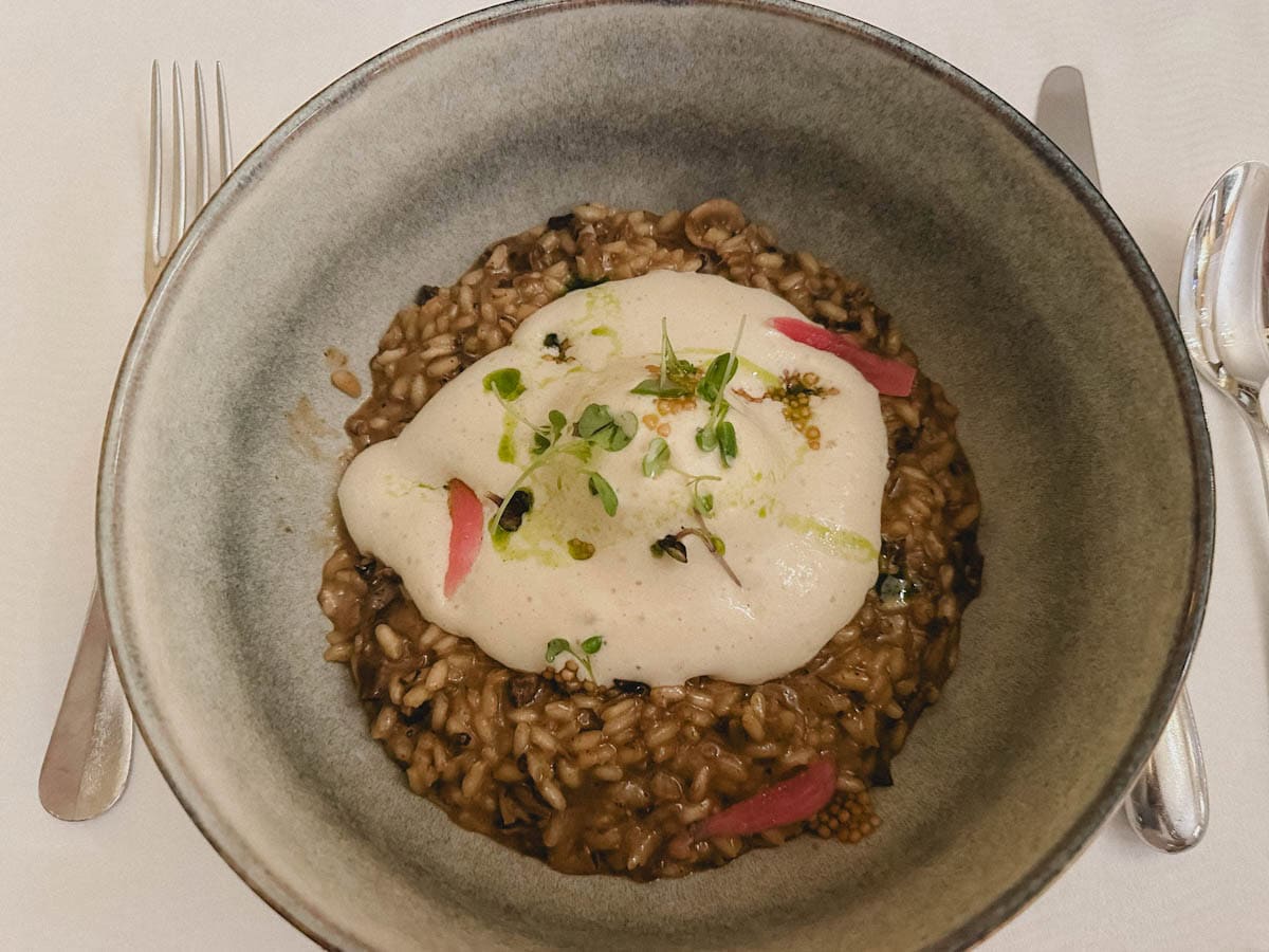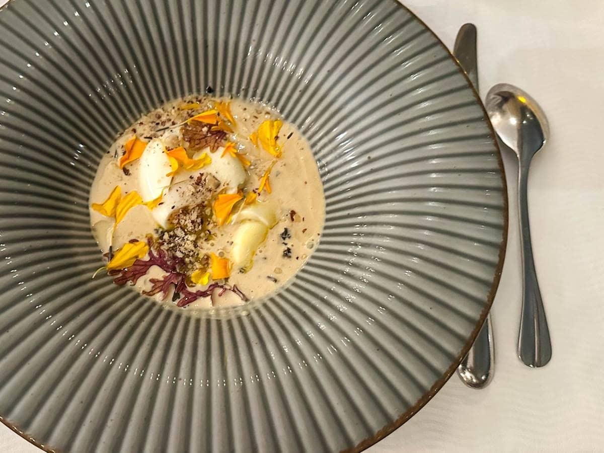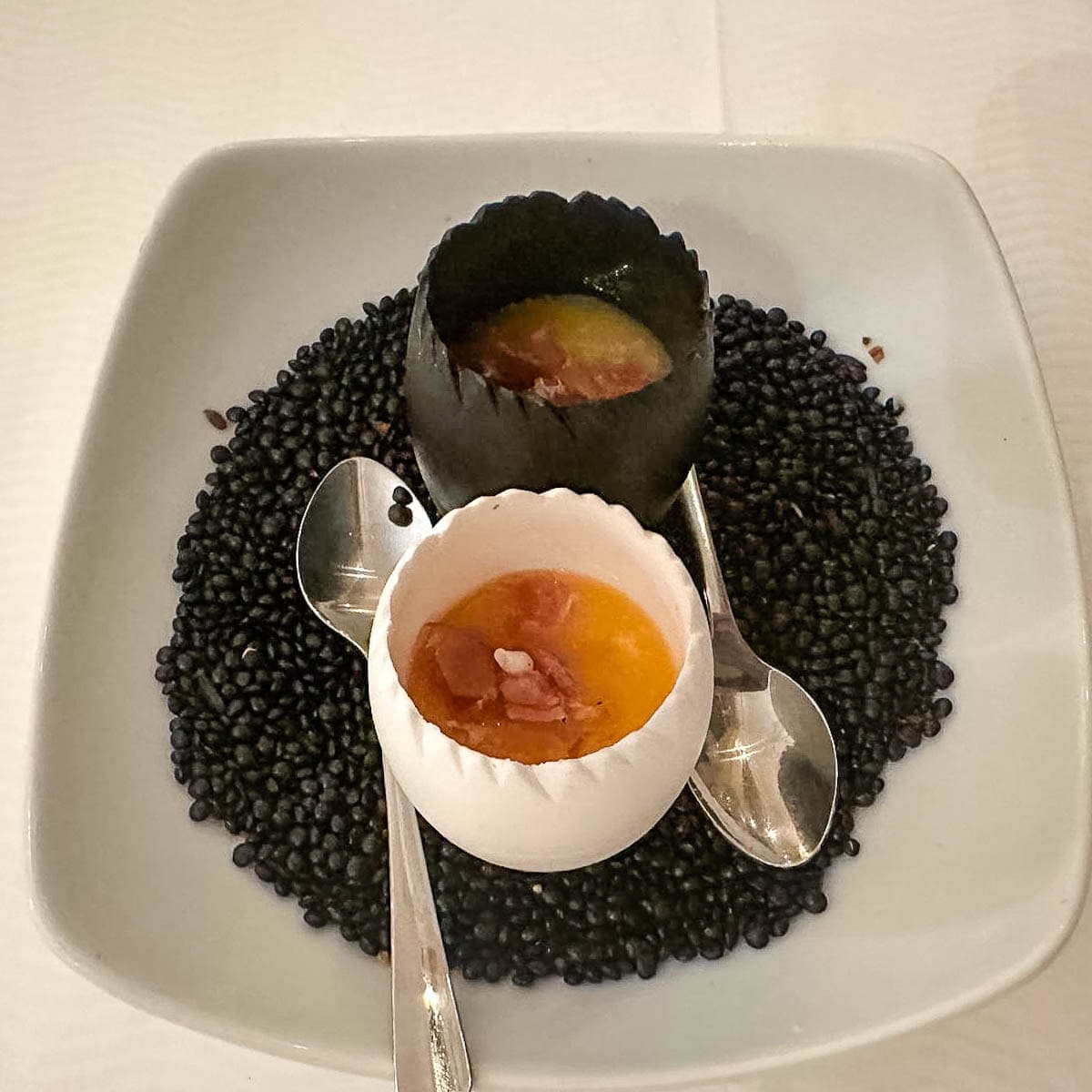 Le filet de maigre cuit à l’unilatérale, Fregola Sarda comme un risotto, boutargue – Carré d’agneau rôti, beurre d’asperges vertes, sauce Paloise, pistache, Népita et petits pois – Filet de bœuf, purée de Vitelotte, artichauts, jus de bœuf à la mangue et miso – Magret de canard en basse température, polenta grillée, betterave acidulé, figue, réduction de pomelo à la verveine – Le Ceviche selon l’arrivage du jour, Lèche de Tigre, algues, sésame et piment