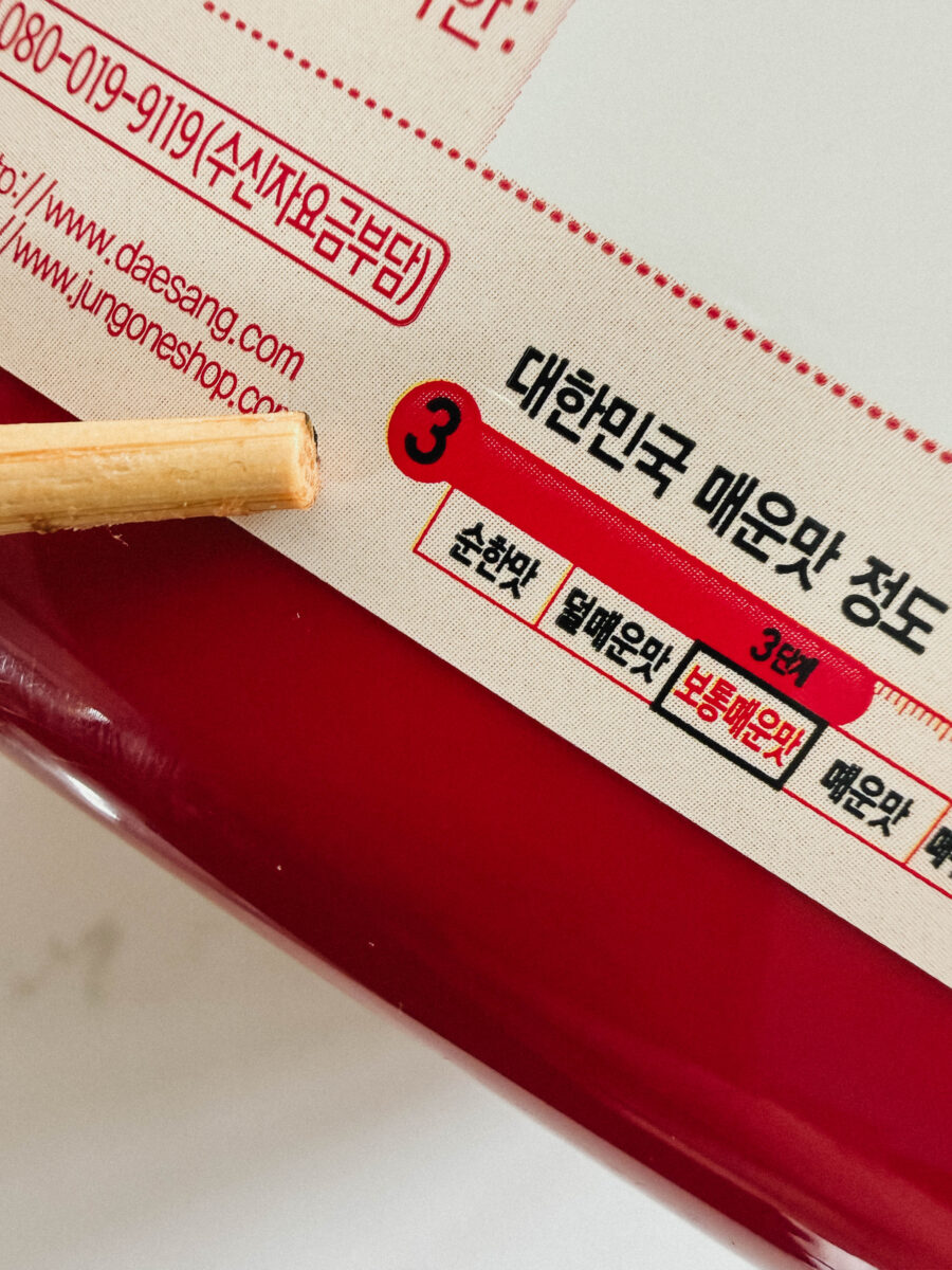 Si vous découvrez le gochujang pour la première fois, il est souvent préférable de commencer avec une version douce ou moyenne. Celle-ci est généralement indiquée par une échelle de piments ou un thermètre avec un chiffre (car plusieurs pots de gochujang sont écrits en… coréen!).