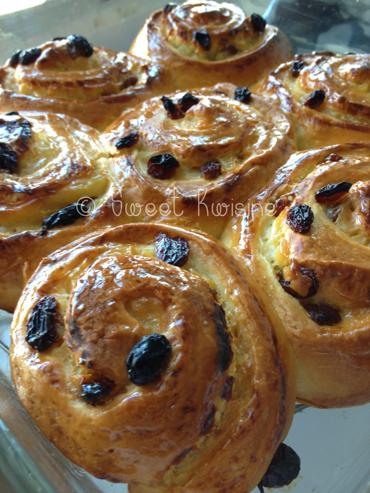 Tu vas la faire avec moi au robot (mais ti tu es musclé tu peux la faire à la main).Dans le bol du robot met : 300 g de farine, la levure, le sucre.Mélange bien à la main puis fixe le crochet sur le robot.Ajoute le sel au reste de farine.Fais tiédir le lait...tiède pas chaud!Fouette l'oeuf dans un petit bol.Dans le bol du robot, ajoute l'oeuf et commence à pétrir doucement.Ajoute en alternance le lait, la farine, le lait, la farine etc... jusqu'à épuisement des ingrédients.Pétris bien la pâte jusqu'à homogénéisation. Si la pâte forme un puits, décolle la des bords du robot avec une spatule.Ajoute enfin le beurre en morceaux en prenant soin de bien intérgrer le morceau de beurre ajouté avant d'en ajouter un autre.La pâte doit être bien élastique et se décoller des bords du robot.Continue de pétrir pendant une ou deux minutes. Si la pâte te semble trop collante, ajoute une ou deux cuillères à soupe de farine en continuant de pétrir.En tout tu vas pétrir environ 10 minutes (15 minutes à la main).Débarrasse la pâte sur le plan de travail légèrement fariné et pétris à la main doucement quelques minutes jusqu'à ce que la pâte se tienne bien. Forme une boule et dépose la dans un saladier. Couvre la de papier film et laisse reposer sous un torchon jusqu'à ce que la pâte ait doublé de volume.Le temps est variable selon la température ambiante. Peu importe la durée, l'essentiel est que la pâte double de volume.Pendant que la pâte lève, mélange tous les ingrédients sec pour la garniture.Une fois la pâte levée, débarrasse à nouveau la pâte sur le plan de travail fariné. Ecrase la bien avec la main pour la dégazer (ça fait pfff, pfff tu entends?) puis étale la au rouleau en un rectangle d'environ 1 cm d'épaisseur. je ne peux pas te donner les dimensions exactes du rectangle que j'ai obtenu mais tu devrais obtenir une longueur d'environ 60 à 70 cm sur 40 cm de largeur.Etale toute la crème pâtissière sur le rectangle de pâte et ajoute les raisins secs.En démarrant sur la longueur, roule la pâte bien serrée.A l'aide d'un couteau assez large et bien aiguisé découpe des rondelles d'environ 4 cm d'épaisseur.N'écrase pas la pâte en découpant les rondelles. Découpe avec délicatesse dans un mouvement de va-et-vient un peu comme une scie. Tu obtiendras une douzaine de rouleaux bien nets et de taille identique.Dans un grand moule profond beurré (type moule à gratin), dispose les ronds de pâte.