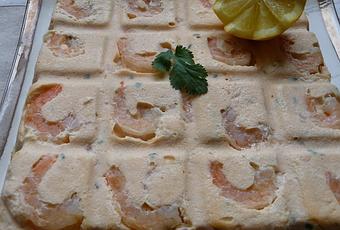 - Placer votre moule sur votre grille froide du four, placer 16 crevettes décortiquées dans chaque carré du moule. Concasser les autres crevettes.