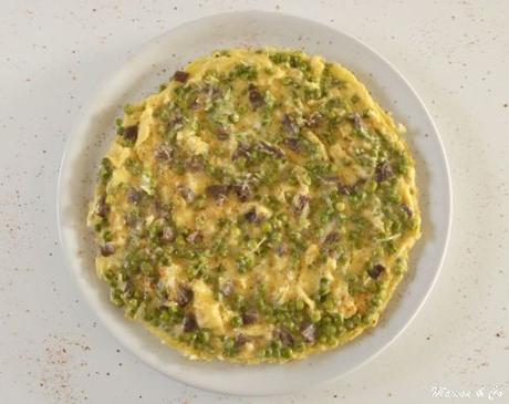 Une simple omelette, oui, mais une omelette thématique ! J'avais envie de remettre toutes les saveurs du Sud-ouest dans mon omelette, alors j'ai choisi de la cuisiner avec des petits morceaux de magret de canard séché, du fromage de brebis, du piment d'Espelette... et des petits pois, mais eux, c'était surtout pour la couleur et le côté équilibré, je ne pense pas qu'ils soient emblématiques du Sud-ouest !!