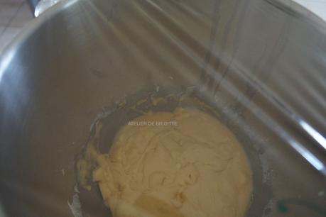 - Ajouter le beurre en morceaux pétrir jusqu'a disparition du beurre (environ 15 mn); ne vous inquiétez pas la pâte est un peu liquide (j'ai rajouté la fleur d'oranger à ce moment)