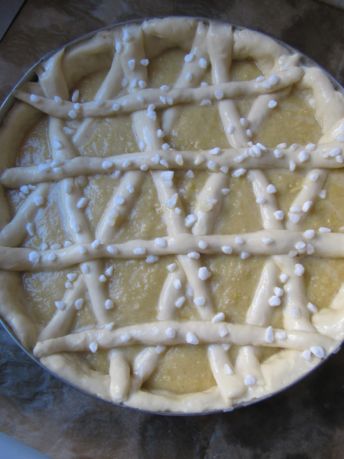 Après le repos au frais de la pâte au pain au lait, l'étaler très finement et foncer un cercle à entremets beurré. Réserver les chutes pour les croisillons. Laisser lever et préparer la crème d'amandes et la parfumer avec tous les ingrédients.