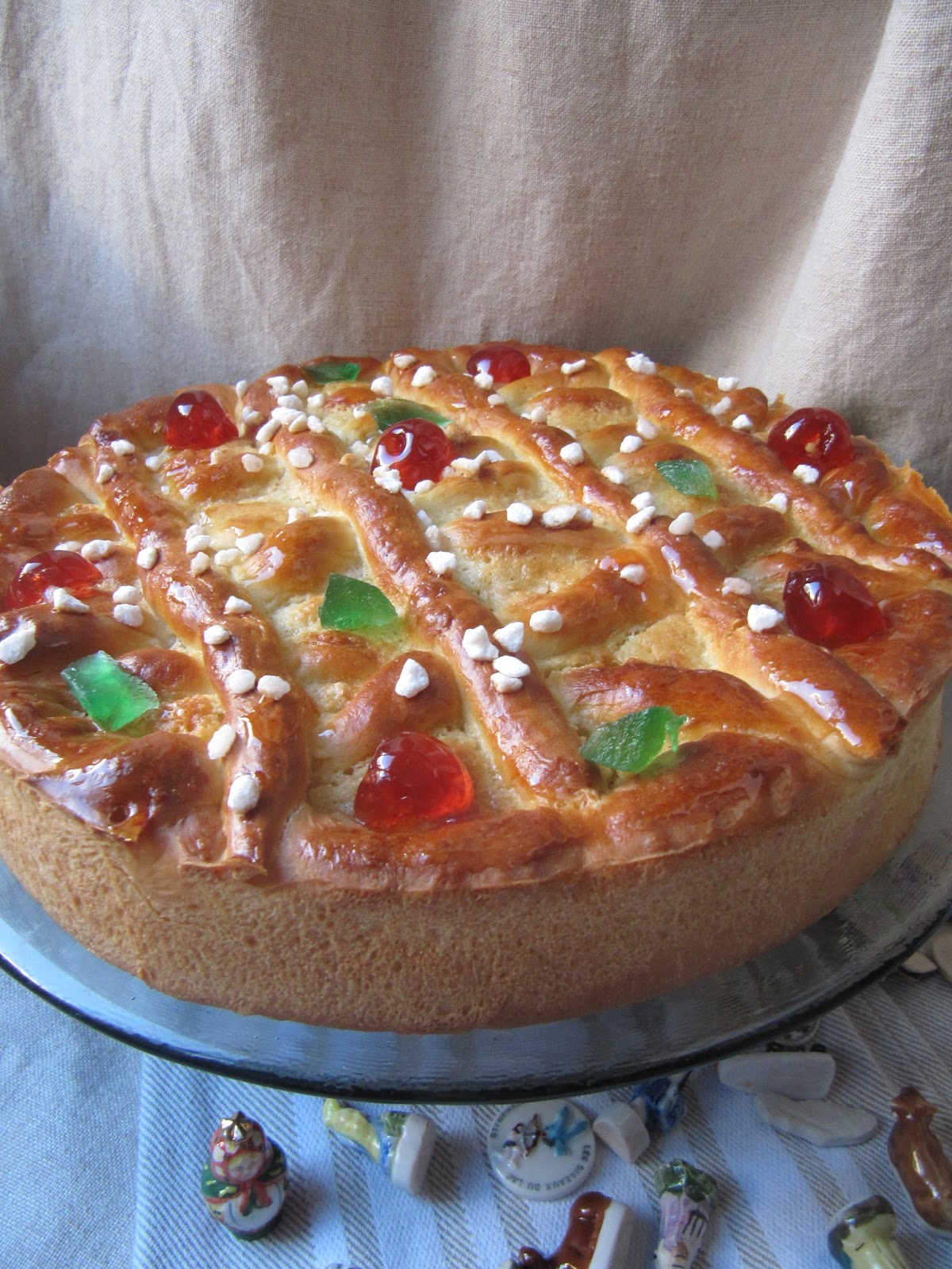450 g depâte à pain au lait1 noisette de beurre1 blanc pour la dorureSucre cassonGelée de coingsFruits confits