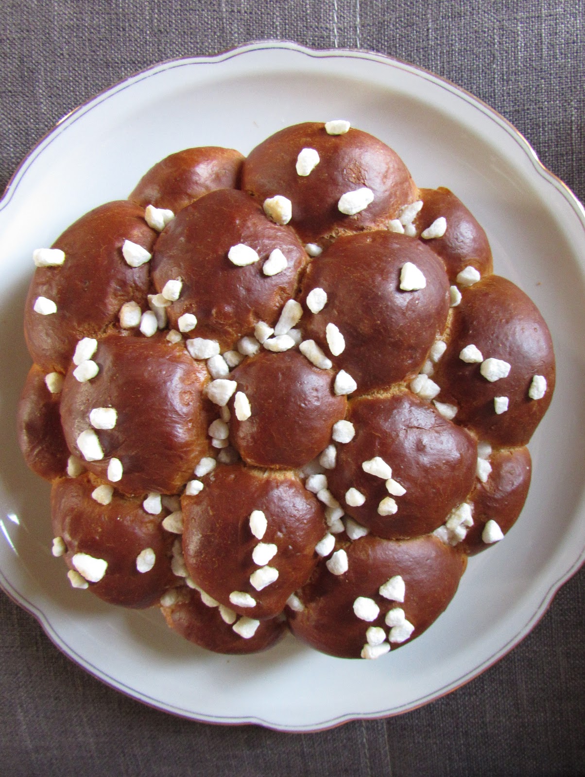 Séparez la pâte en 12 boules (j'ai fait au pif), les façonner et les placer en laissant des espaces entre car la pâte va gonfler, dans un moule rond (ici 20 cm) préalablement beurré et fariné.J'ai laissé levé tout la nuit au frigo, mais vous pouvez laisser lever à t° ambiante avec un linge jusqu'à ce que la pâte ait doublé de volume.Faites préchauffer le four à 180°C.Badigeonnez de lait et de sucre perlé et enfournez pour environ 25 à 30 minutes. (Il faut qu'elle soit bien dorée)