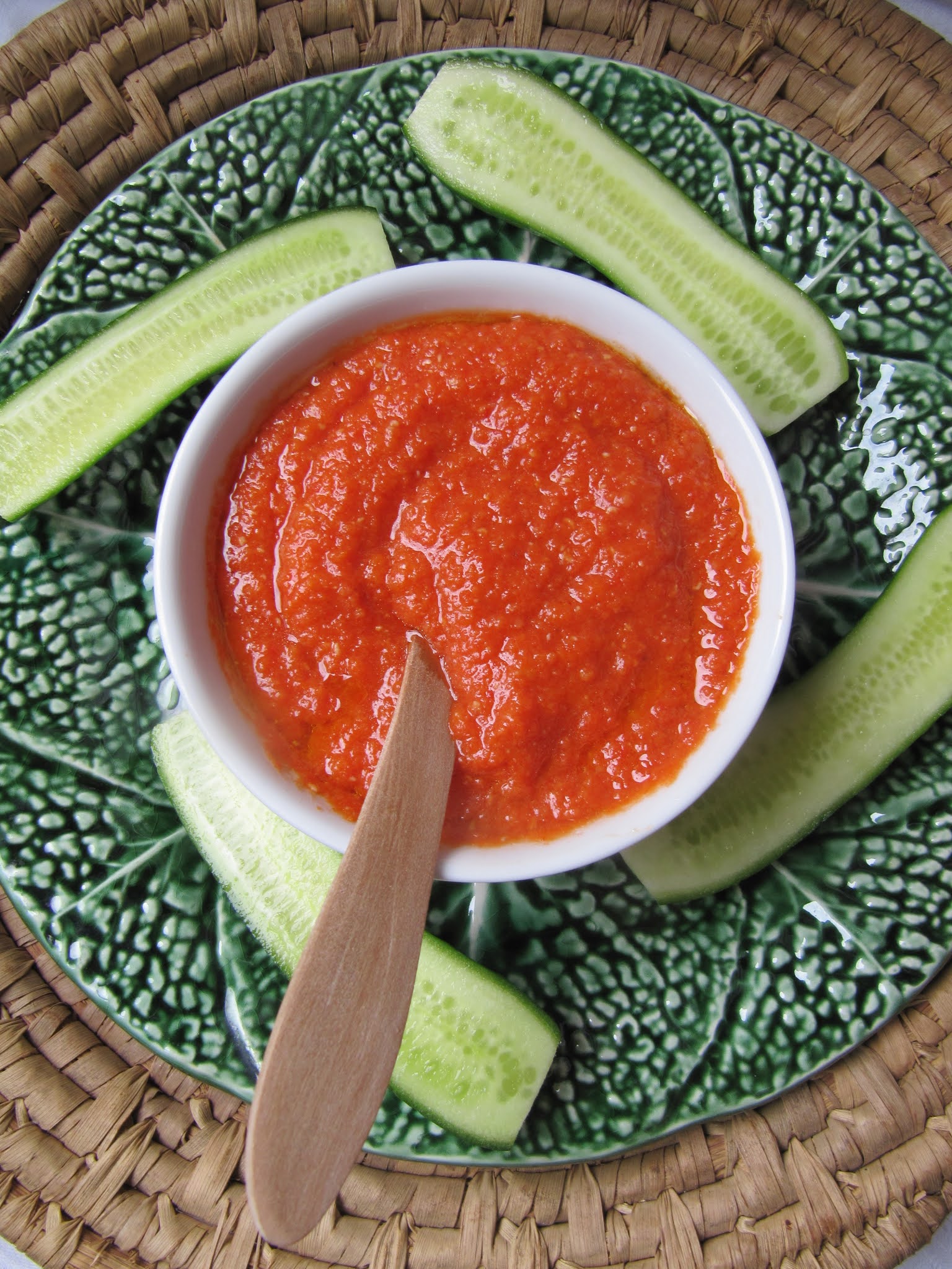 Ingrédients100 g lentilles corail2 beaux poivrons rouges 3 cs de tahini1 belle gousse d'ail2 cs d'huile d’oliveSel, piment d'Espelette