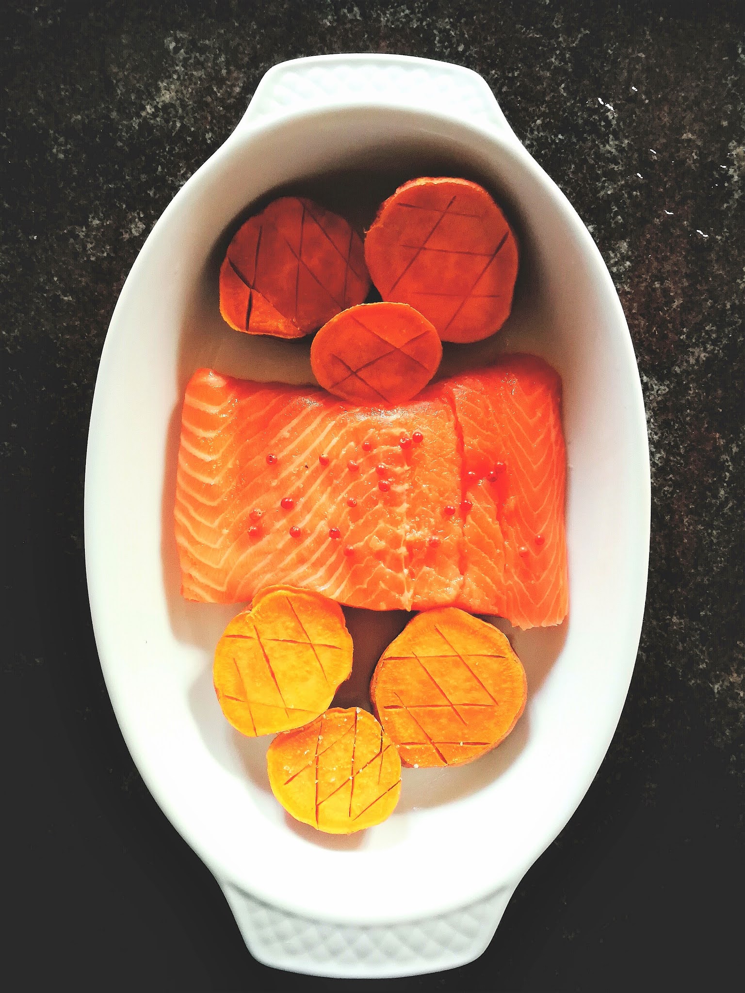 Pour le plat principal, j'ai coupé en tranches épaisses une belle patate douce. Après avoir citronné et entaillé les rondelles, je les ai précuites au MO pendant 5 bonnes minutes à pleine puissance. Je les ai ensuite enfournées avec un filet de saumon épais parsemé de quelques baies roses, pour 20 min à 180°. Du Maroilles spécialement rapporté par Cher & Tendre de Maubeuge, des oranges à la cannelle en dessert ainsi qu'un Saint Eugène tout moelleux pour le café ...