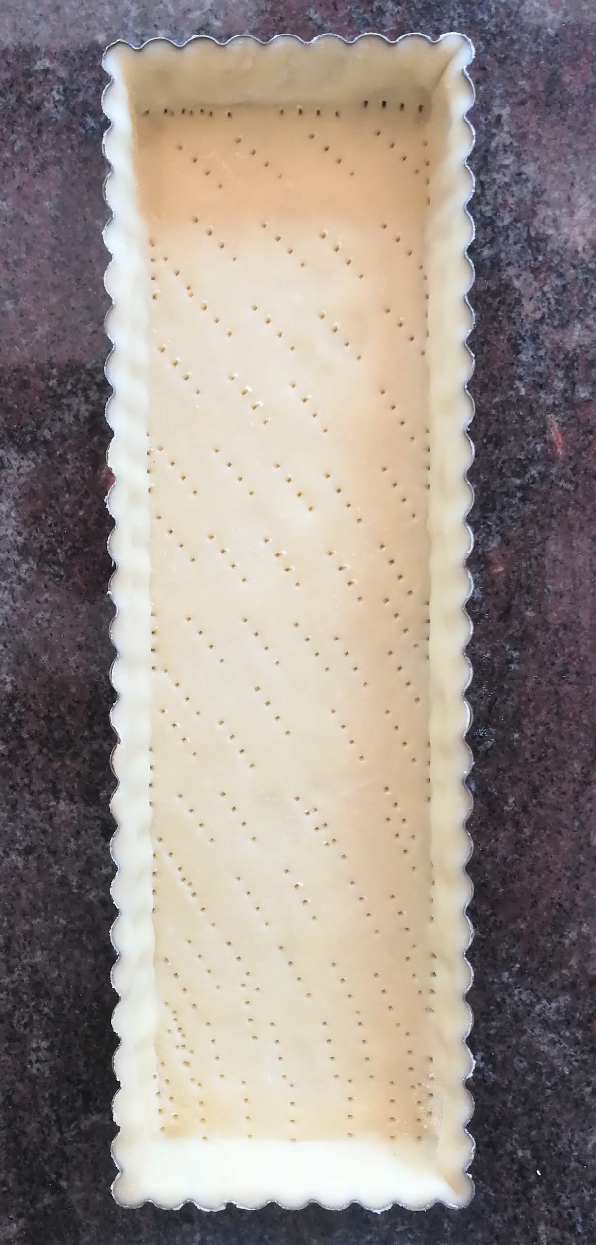 Étaler la pâte brisée longuement reposée dans le moule soigneusement beurré au pinceau. Piquer le fond à la fourchette.