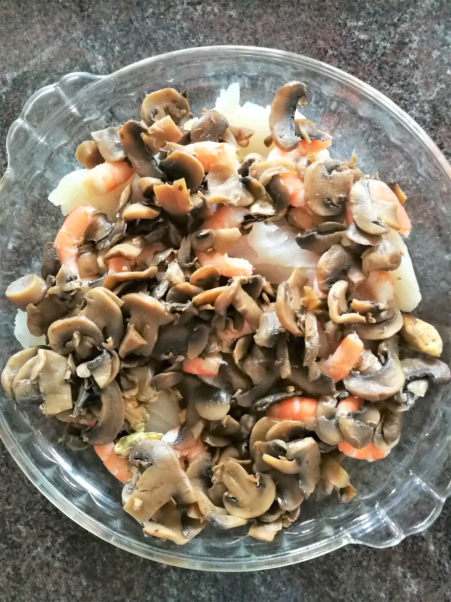Ingrédients400 g de cabillaud frais250 g de moules surgelées250 g de crevettes décortiquées500 g de champignons frais1 trait d'huile d'olive1 noisette de beurreSauce financière2 échalotesFumet de crevettes100 g de crème épaisse1 cs de farine20 g de beurreFaire sauter à feu vif les champignons dans l'huile chaude pour qu'ils perdent toute leur eau de végétation. Dans un plat à gratin légèrement beurré, répartir le cabillaud détaillé en gros morceaux, les crevettes, les moules et les champignons.
