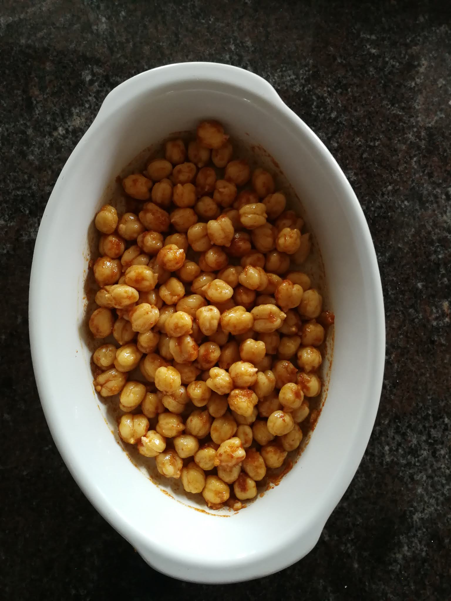 Egoutter les pois chiches et enlever la peau, c'est un peu fastidieux mais en écoutant la radio, ça passe plus vite ... Assaisonner les pois chiches d’huile d’olive, sel, piment, paprika, ail écrasé, cumin, gingembre et bien les enrober. Cuire une trentaine de minutes en remuant de temps en temps, à four préchauffé à 190°, pour que les pois chiches soient bien dorés, tout en restant moelleux.