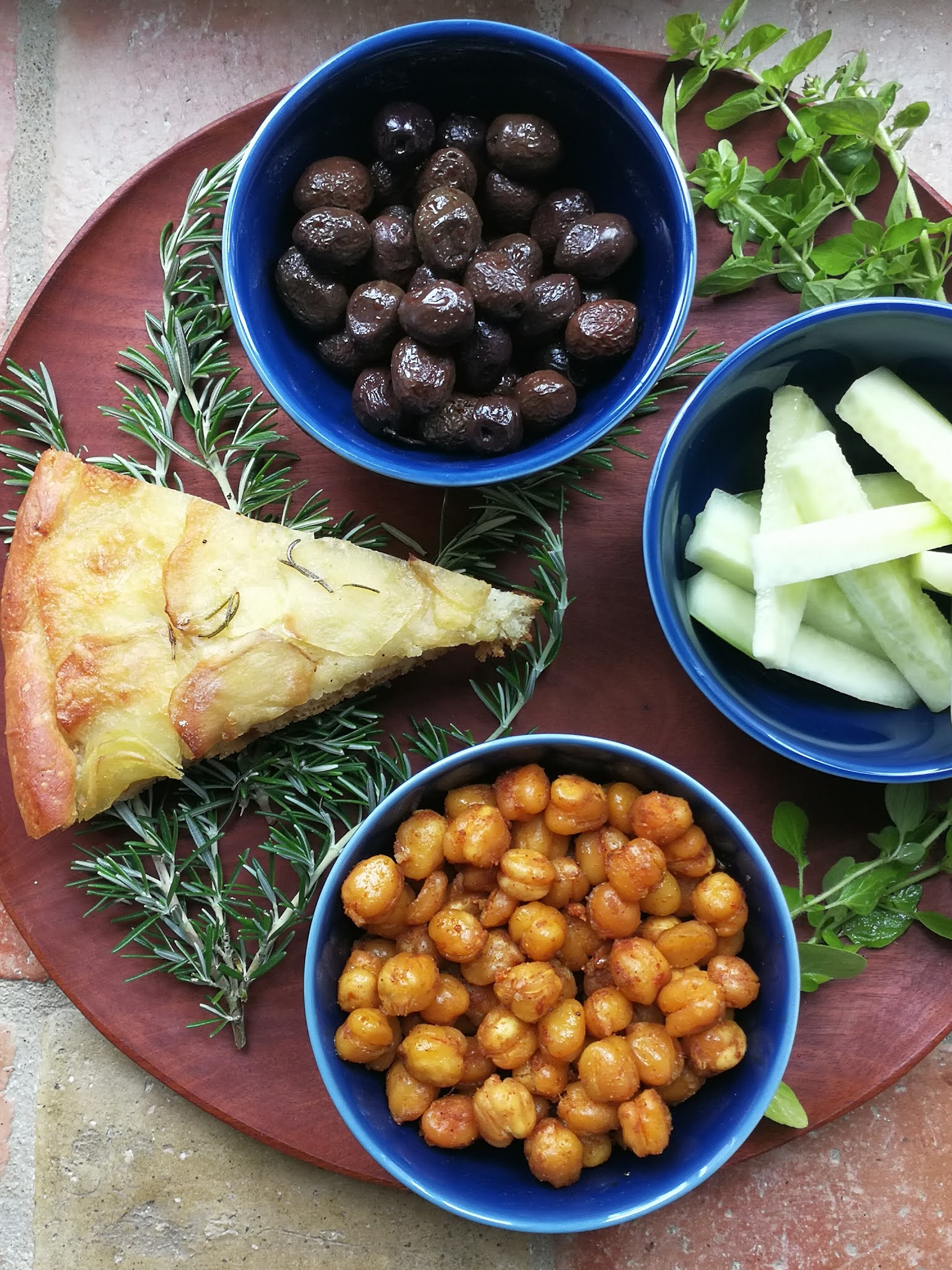 J'ai servi les pois chiches avec de la schacciata, des olives et des bâtonnets de concombre.