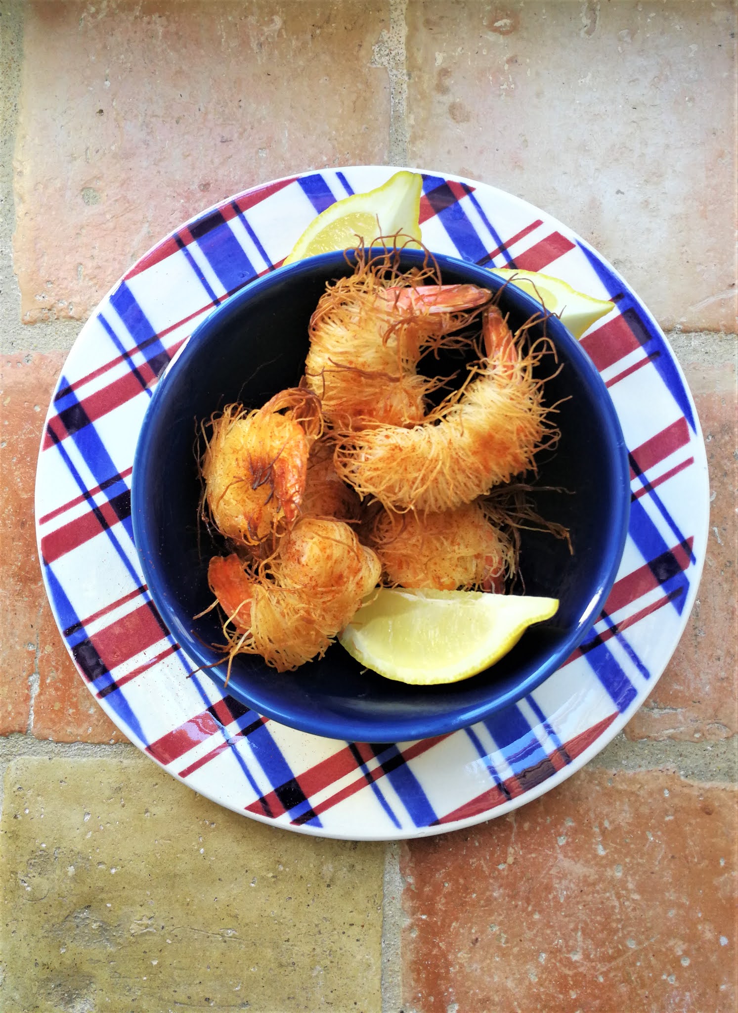 Ingrédients2 douzaines de crevettes100 g de kadaïfBeurreCitronDémêler délicatement l'écheveau de fils de kadaïf, séparer de petites bandes que l'on enroule autour des crevettes décortiquées en gardant la queue (bien conserver les carapaces que l'on utilise pour le fumet de crevettes). Disposer les crevettes enrobées sur une plaque recouverte de papier cuisson, napper de beurre fondu au pinceau et cuire à 200°, une dizaine de minutes : les crevettes doivent être bien dorées. Servir aussitôt avec un filet de citron.